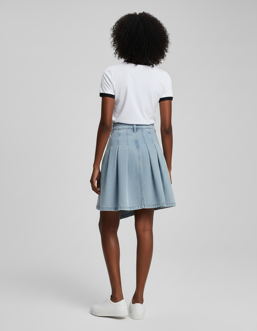 Ce modèle se distingue par son denim premium d'un bleu intemporel et sa conception portefeuille astucieuse, rehaussée de plis délicats et de boutons métalliques discrets. Loin des standards conventionnels, cette jupe offre une silhouette structurée mais fluide, un équilibre parfait entre audace et raffinement. Chaque détail a été pensé pour créer une pièce haut de gamme qui transcende les tendances, assurant à la fois durabilité et un chic incontestable. C'est l'investissement parfait pour un dressing contemporain et conscient.