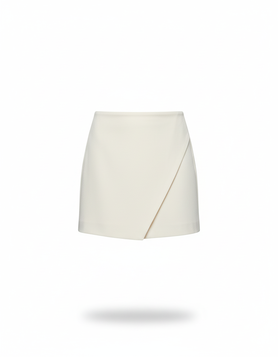 Cette jupe courte de couleur beige présente une conception portefeuille asymétrique.
