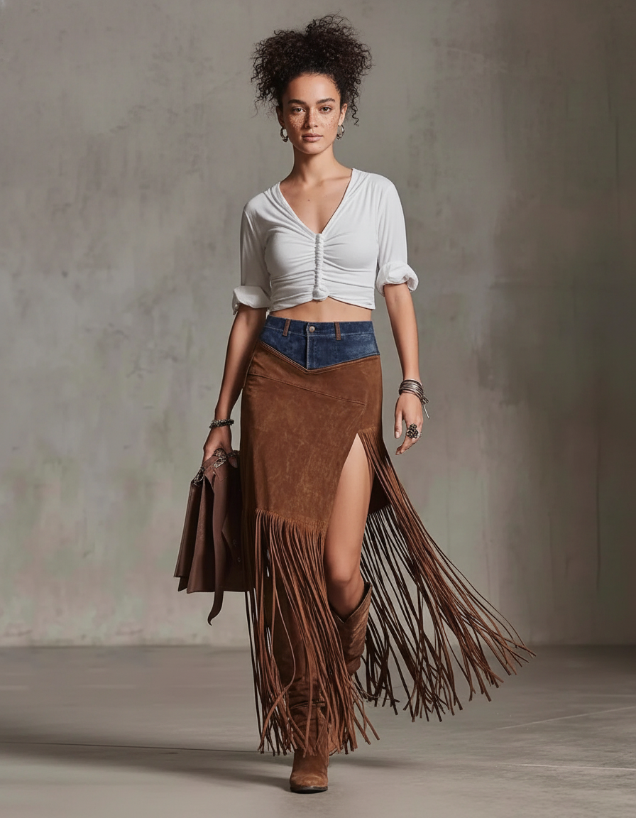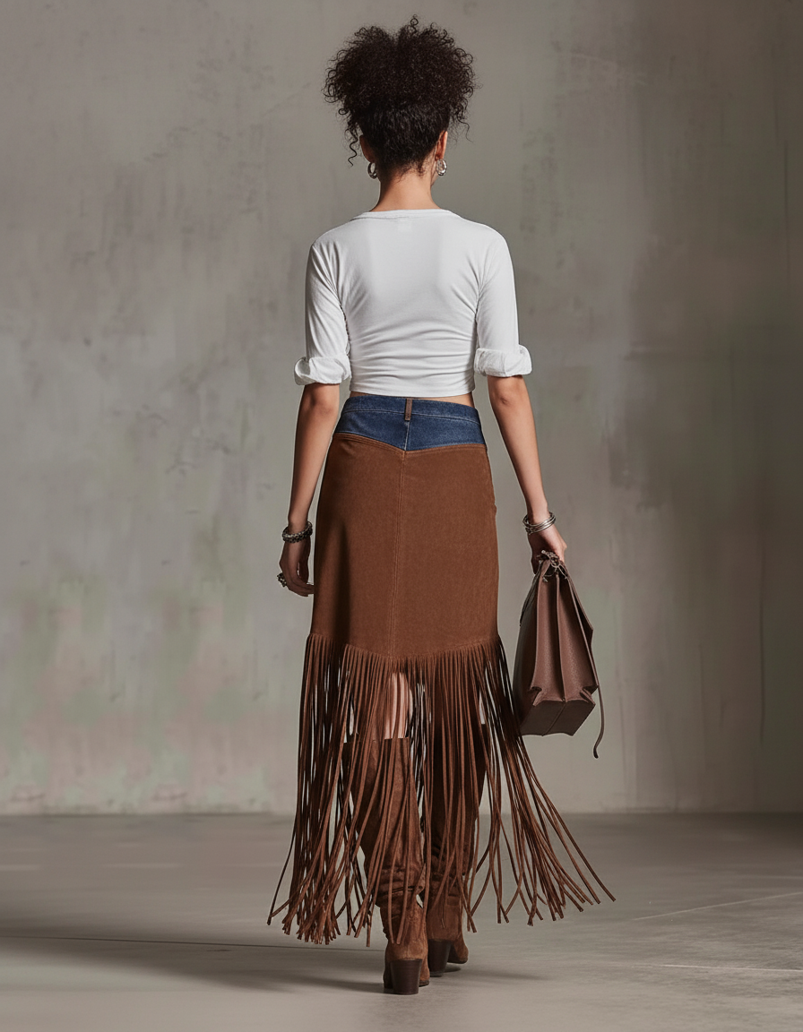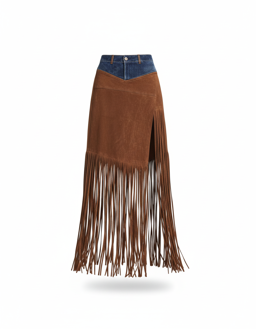 Cette jupe longue est confectionnée en daim de couleur marron, avec une taille haute et un empiècement en denim. Elle présente une fente latérale et est ornée de longues franges sur les côtés et l'ourlet.