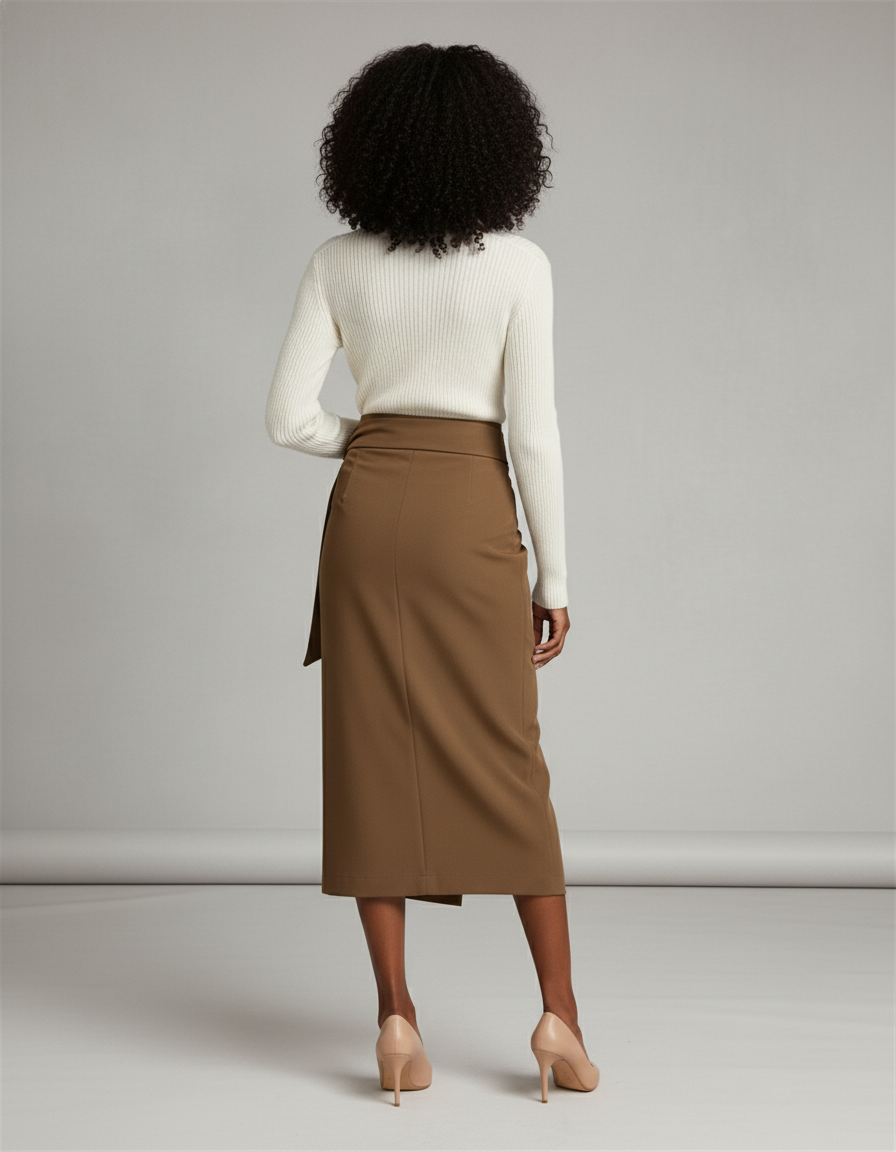 Conçue pour la femme moderne, la Jupe Portefeuille Drapée en kaki est votre passeport pour une élégance sans effort, du bureau aux rendez-vous après-travail. Associez-la à un pull fin en maille côtelée, comme notre modèle, pour un look sophistiqué et décontracté, ou optez pour une blouse en soie fluide et des talons pour une silhouette plus formelle et affirmée. Sa teinte kaki intemporelle offre une multitude de possibilités, s'harmonisant parfaitement avec des tons neutres ou des accents plus vifs, pour exprimer votre style unique avec distinction.
