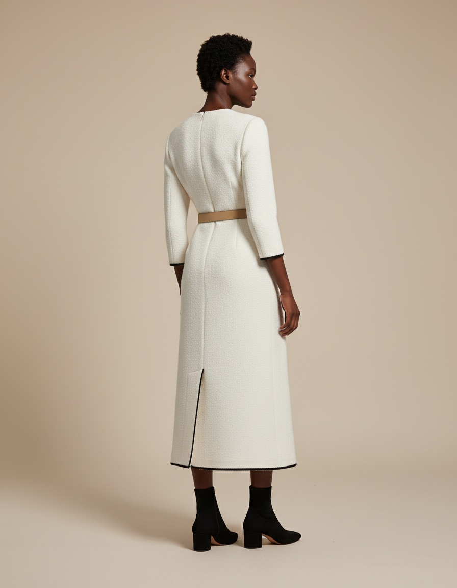 Conçue pour la femme moderne, notre Jupe Portefeuille Longue Blanche en tweed incarne un raffinement intemporel. Son tombé impeccable assure une silhouette structurée mais fluide, idéale pour vos journées de travail. Le tweed de haute qualité offre une tenue irréprochable sans sacrifier le confort : vous vous sentirez à l'aise et libre de vos mouvements, même lors des journées les plus intenses. Chaque détail, des boutons dorés au liseré contrastant, est pensé pour une allure sophistiquée et professionnelle, soulignant votre élégance naturelle.