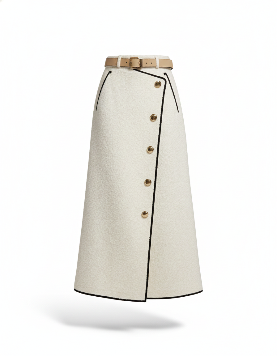 Découvrez l'incarnation du chic moderne avec notre Jupe Portefeuille Longue Blanche. Conçue pour la femme exigeante qui navigue entre ses engagements professionnels et ses soirées mondaines avec une aisance naturelle, cette pièce est le secret d'une allure impeccable. Son tweed texturé d'un blanc éclatant, rehaussé de liserés noirs contrastants et de boutons dorés subtils, offre une sophistication intemporelle. Elle sculpte la silhouette avec grâce, vous assurant une présence remarquée et une confiance inébranlable, où que vous alliez.