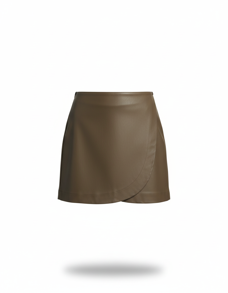 Cette jupe portefeuille marron est un modèle court avec une coupe asymétrique. Elle présente un effet cuir lisse.