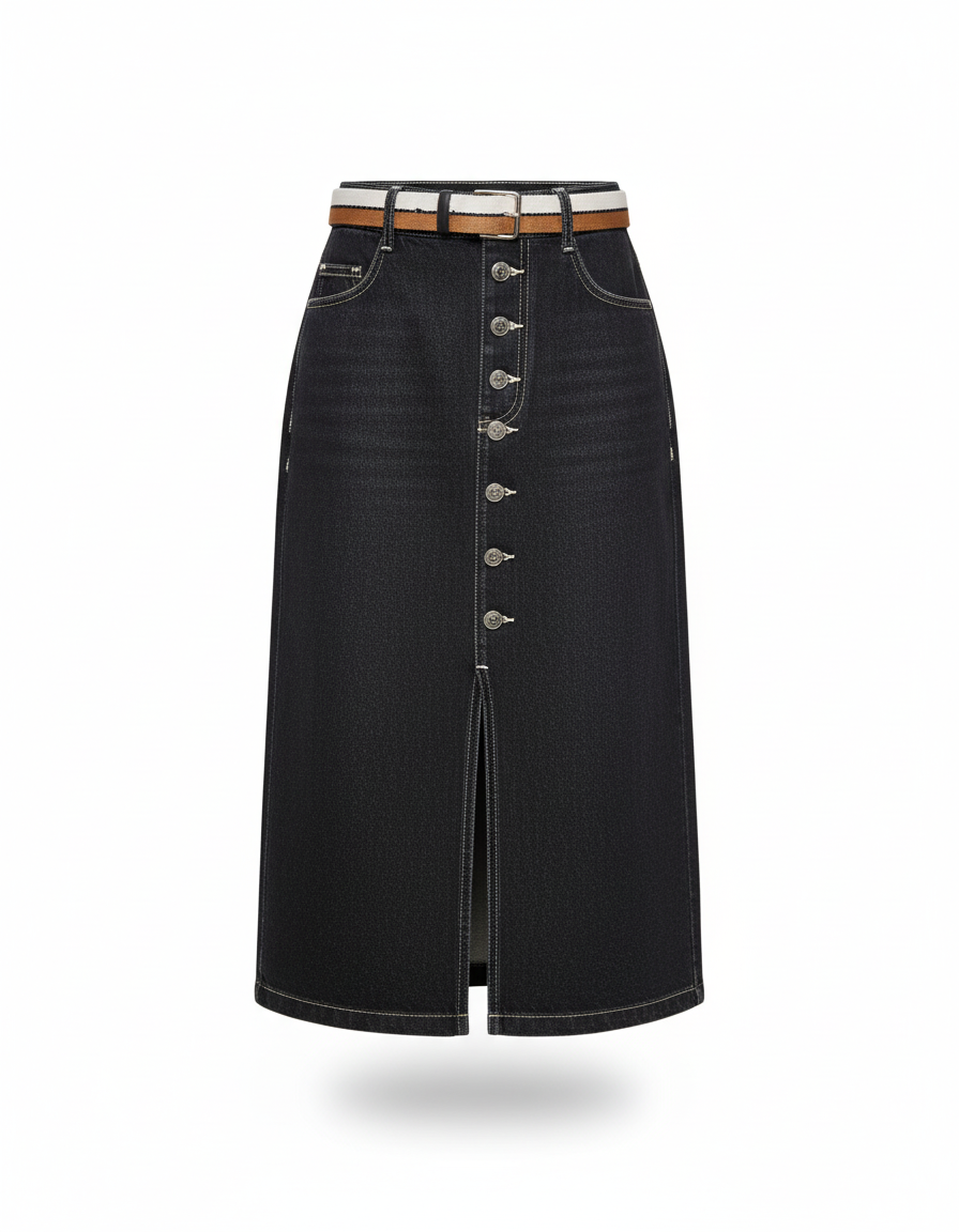 Découvrez la Jupe Portefeuille Noire, pièce maîtresse de votre dressing moderne, conçue pour la femme qui refuse de choisir entre confort et raffinement. Taillée dans un denim noir de qualité supérieure, cette jupe midi enveloppe subtilement la silhouette, offrant une liberté de mouvement inégalée et une allure naturellement chic. Son design portefeuille, rehaussé d'une rangée de boutons discrets et de surpiqûres contrastantes, apporte une touche contemporaine et structurée. C'est l'incarnation parfaite du luxe discret, facile à vivre et infiniment polyvalente.