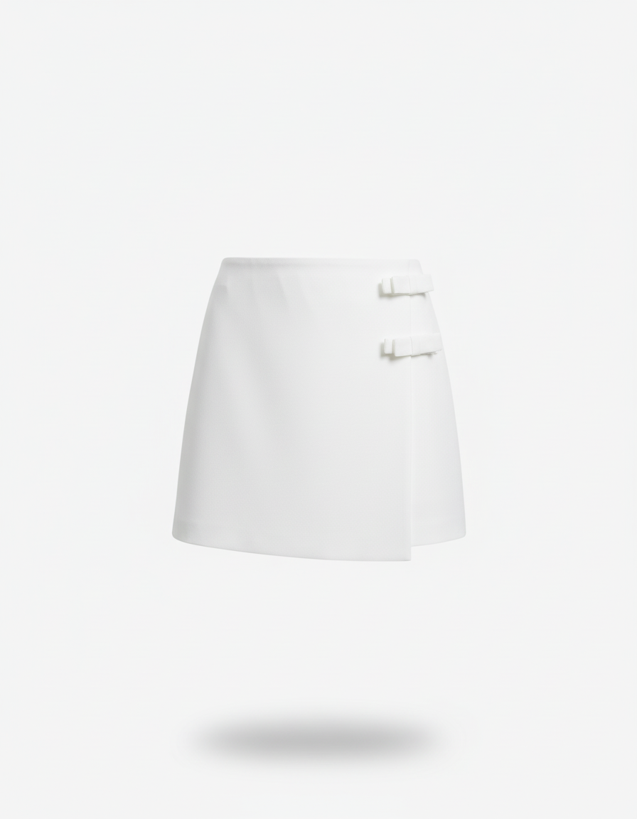 Cette jupe courte portefeuille de couleur blanche présente un ourlet asymétrique. Elle est agrémentée de détails décoratifs sur le côté.